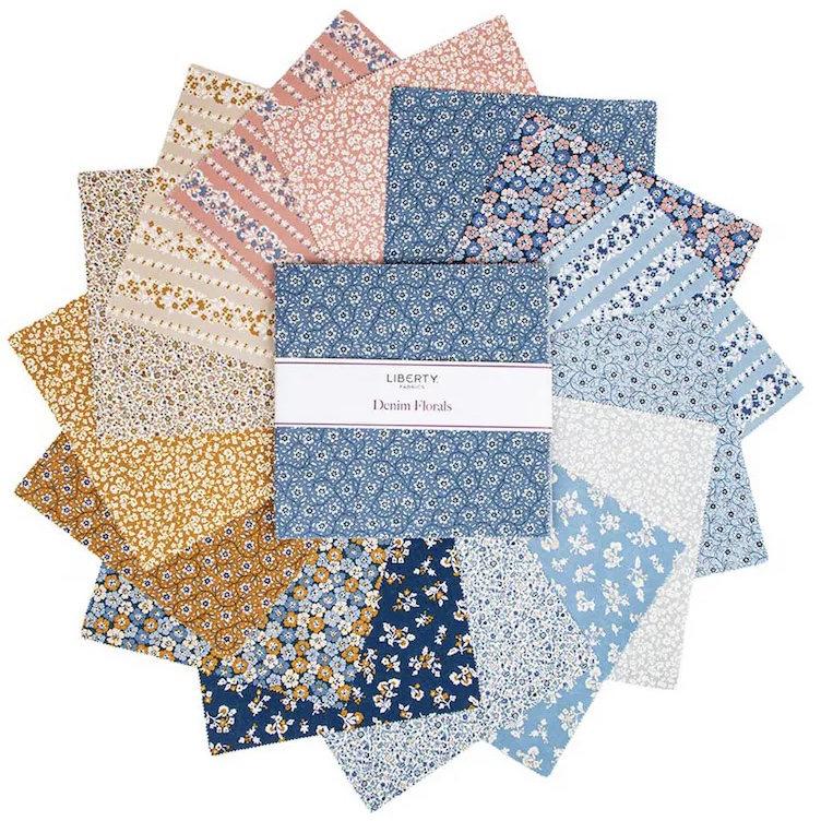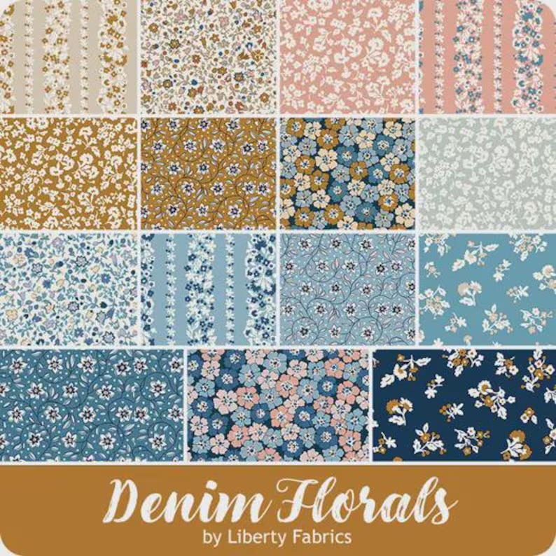 42 pieces; This fabric collection, Liberty Denim Florals, features a delightful array of floral patterns in denim-inspired hues. The design showcases a harmonious blend of small, detailed flowers in shades of blue, beige, and mustard, creating a vintage yet modern aesthetic.