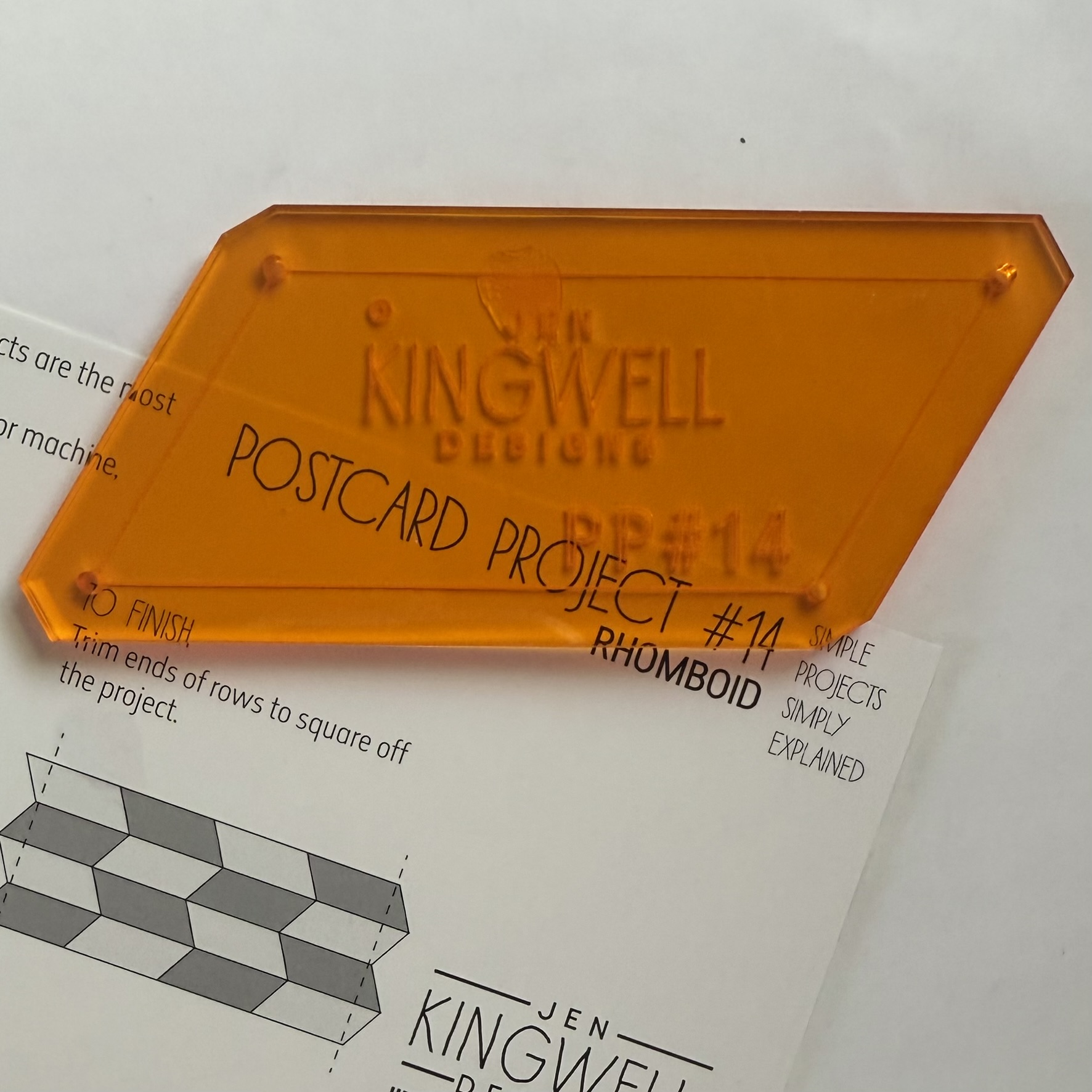 This project features a vibrant, transparent orange template with a rhomboid design, allowing for precise cutting and piecing.