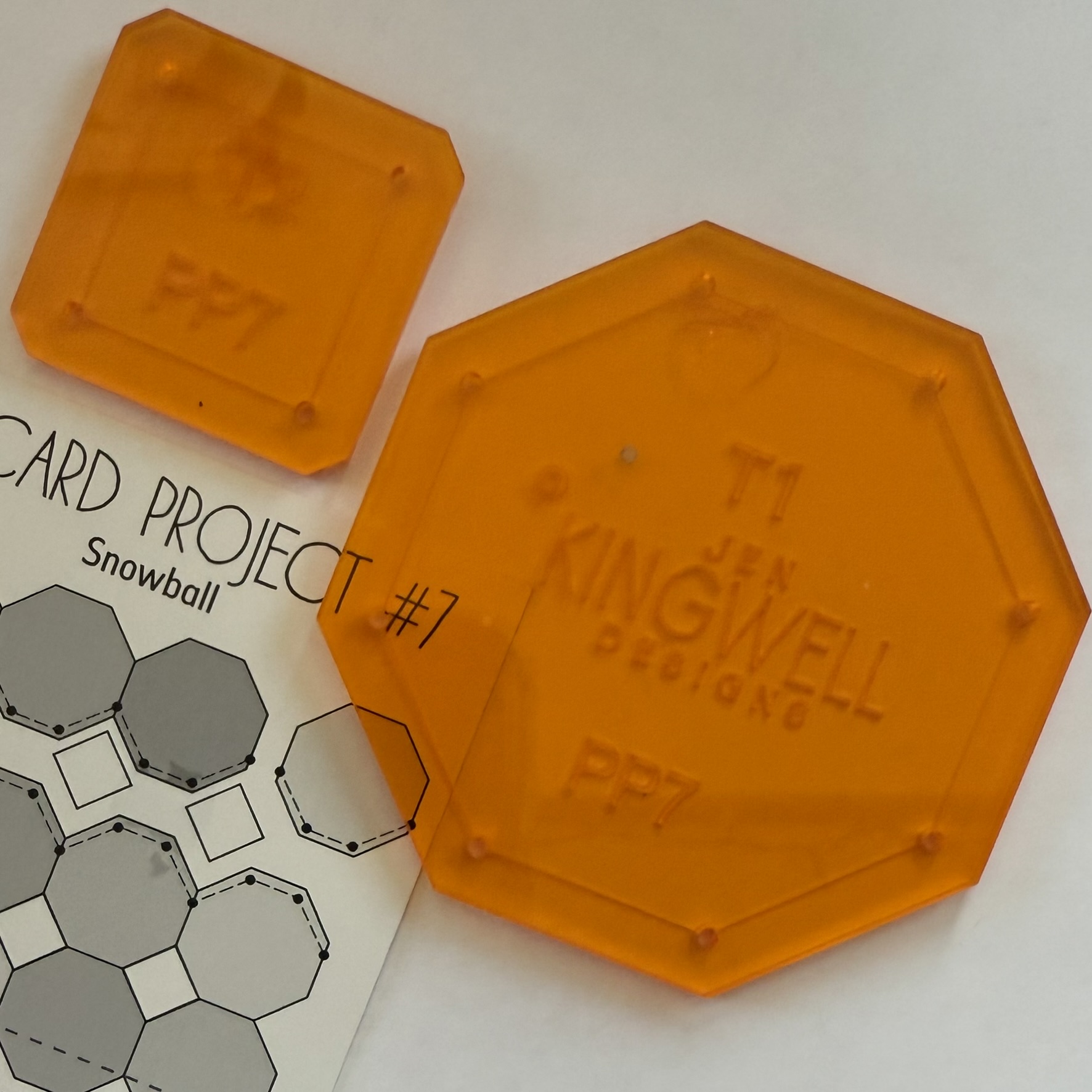 The pattern includes a vibrant acrylic template featuring a geometric pattern of octagons and squares, ensuring precision in your patchwork.